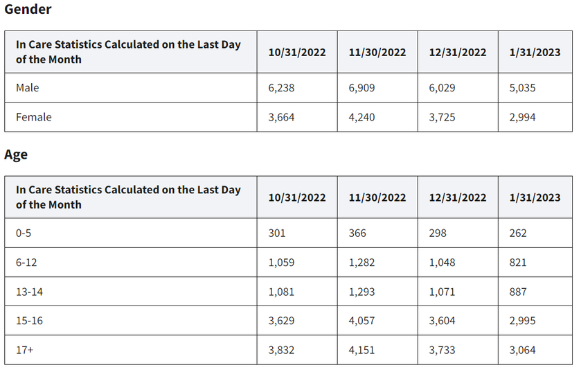 - Kids are living in various foster homes or facilities for an average of about 18 months.