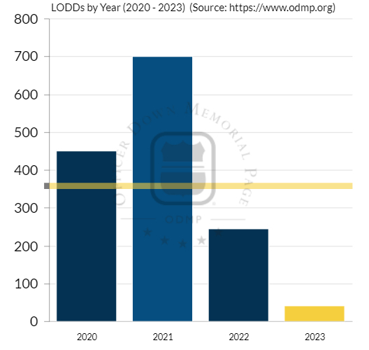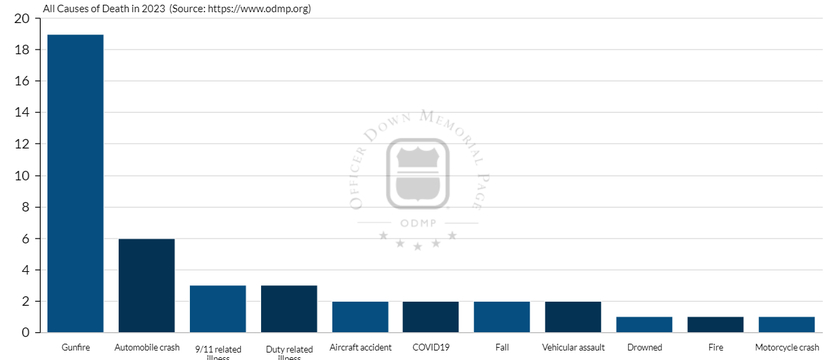 The line-of-duty deaths tracked include vehicular crashes, fire, falls, and various medical-related deaths, including from COVID-19 as well as the effects of the Sept. 11 terrorist attacks.